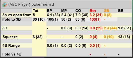 BTN: $34.69 - VPIP: 19, PFR: 9, 3B: 2, AF: 1.6, Hands: 99
